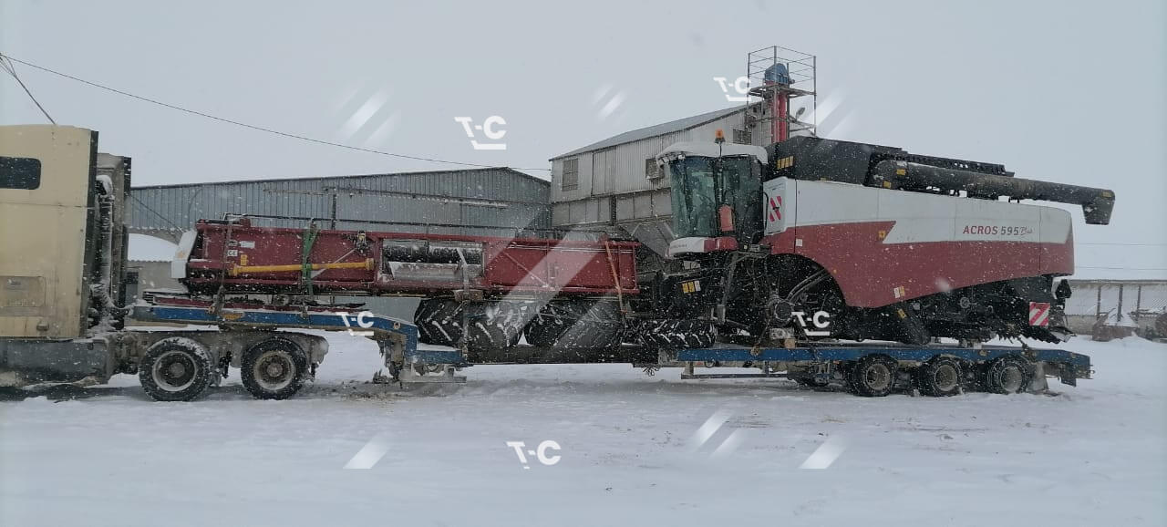 Комбайн Акрос 595 plus с жаткой — 1 ед Габариты: комбайн 8850*3300*3590 + жатка Д7500мм и демонтированные колёса, общий вес 16080 кг